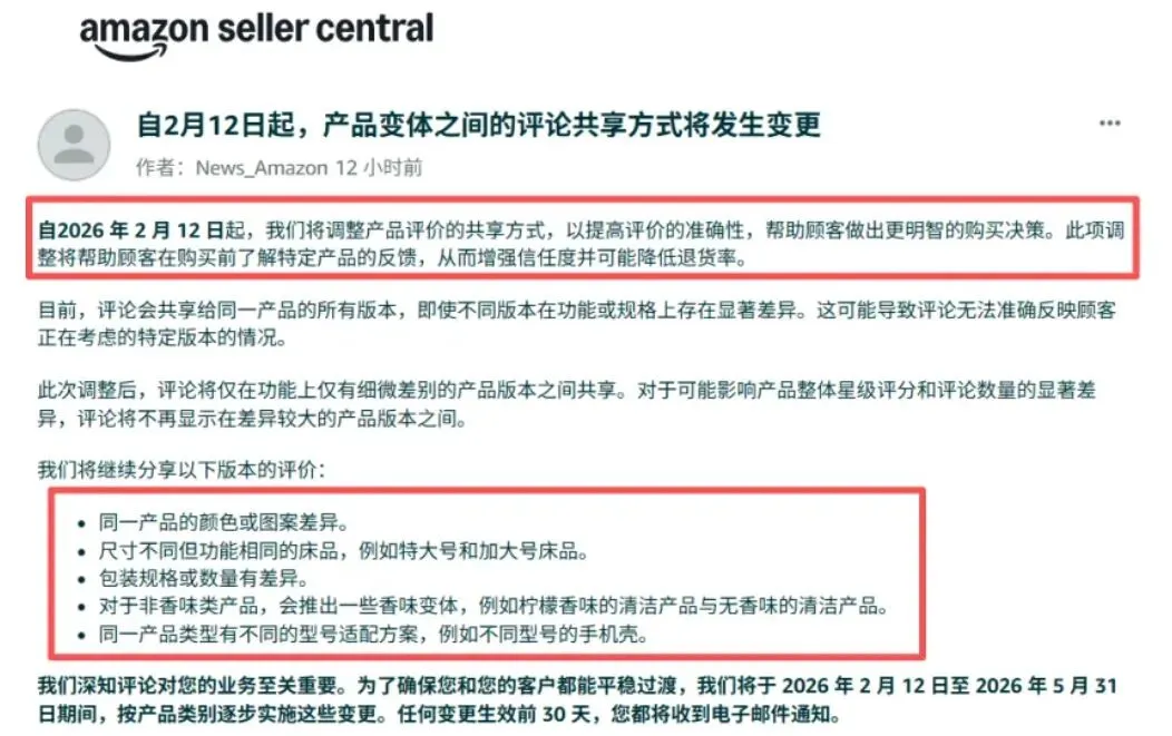 2026年1月15日,亚马逊官方正式宣布,将对产品变体的评论共享规则进行重大调整!