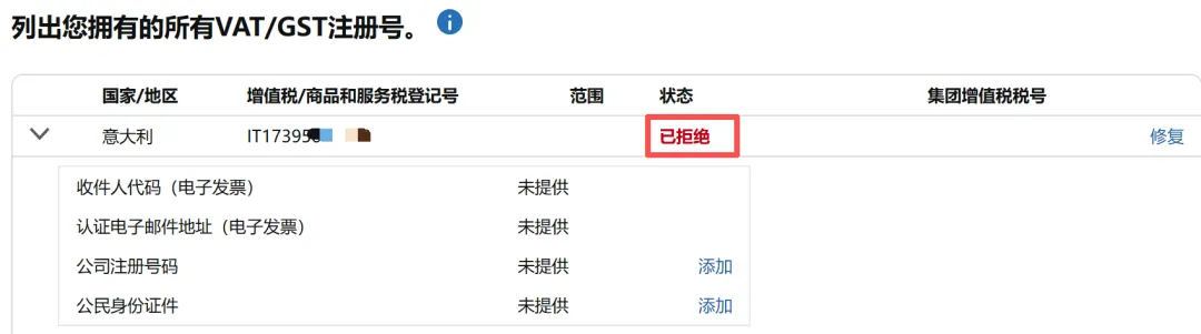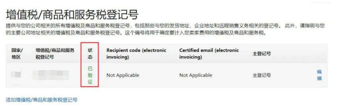 第四步:意大利VAT添加成功,税号会显示“等待验证”,平台审核时效大概1-3个工作日