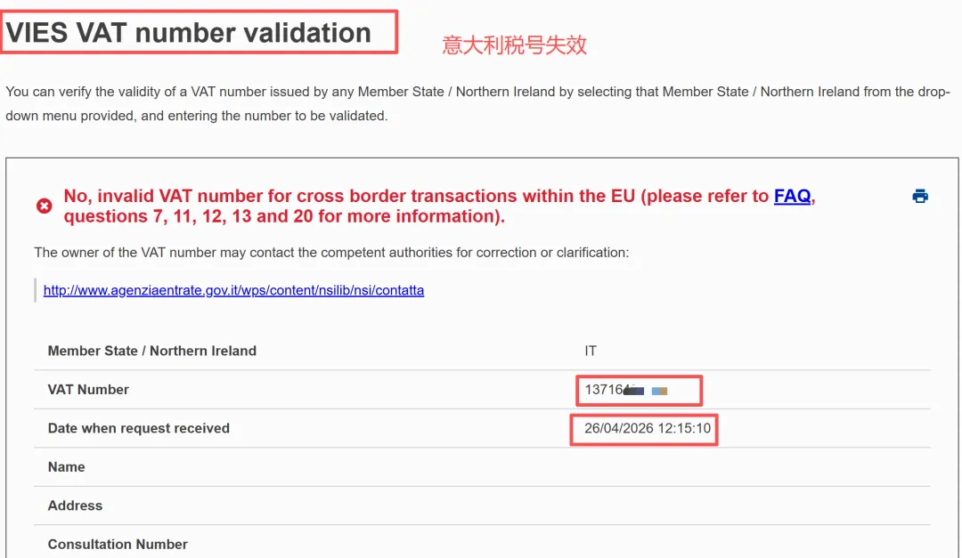 出海者小编提示:最近很多意大利VAT失效,主要的原因是没有解决意大利海牙认证或者意大利5万欧元保证金政策(或者保险保函代替)。
