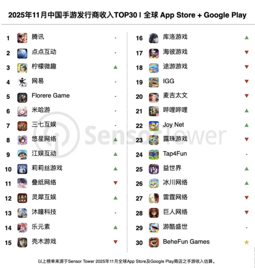 2025年11月中国手游发行商 TOP30 来源:Sensor Tower