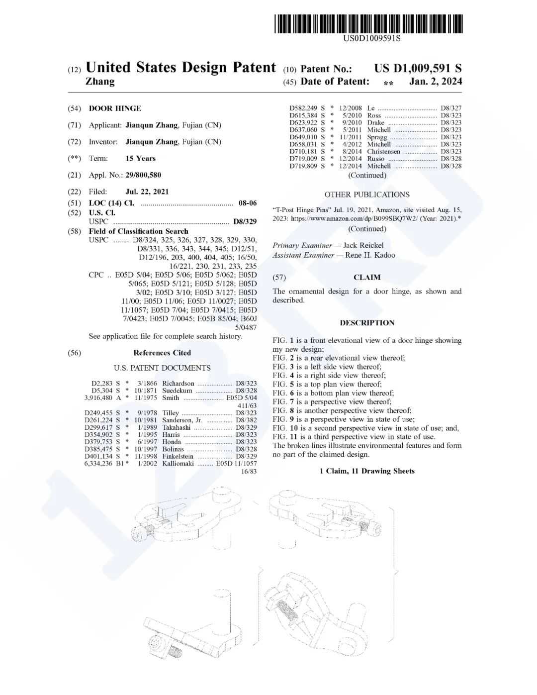 原告在24年1月2日拿到这款门铰链的外观专利US D1,009,591 S