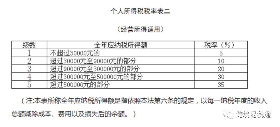 根据《中华人民共和国个人所得税法》第三条及第六条,经营所得,以每一纳税年度的收入总额减除成本、费用以及损失后的余额,为应纳税所得额,适用百分之五至百分之三十五的超额累进税率。