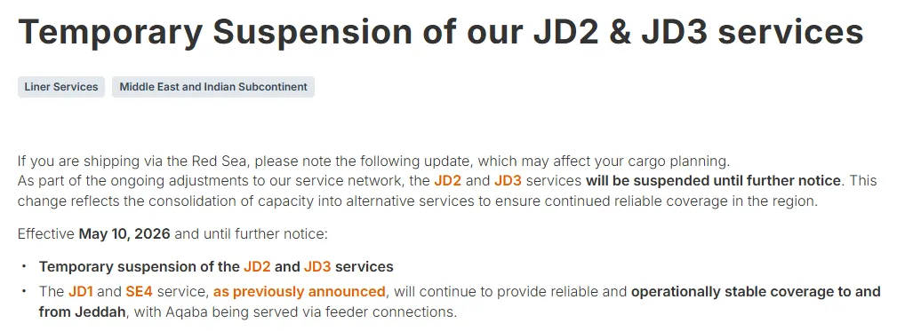 据介绍,JD2航线此前连接丹吉尔、塞得港东港及吉达等关键节点,JD3航线则覆盖塞得港东港、亚喀巴与吉达等港口。两条航线的停运,意味着红海区域多条支线运输能力被削弱。虽然部分运力将被重新分配至JD1、SE4等替代航线,但业内普遍认为,替代方案难以完全弥补原有航线的舱位和时效损失。