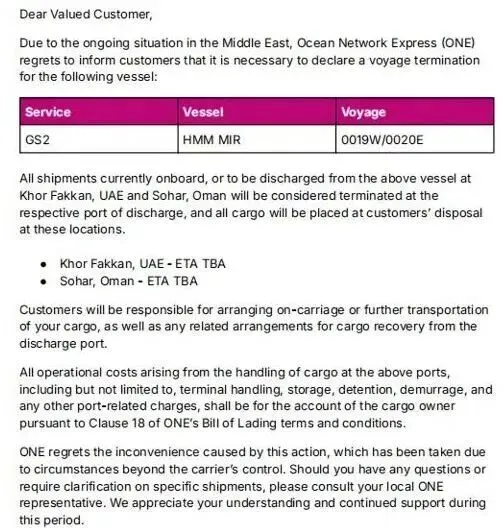 与此同时,另一家航运巨头海洋网联船务(ONE)也发布紧急通知,宣布终止GS2航线“HMM MIR”轮(航次0019W/0020E)的原定中东航程。该轮原计划从中国多个主要港口(包括大连、天津、青岛、上海、宁波及蛇口)装载货物,经新加坡前往杰贝阿里、达曼及阿布扎比等中东港口。