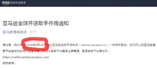 亚马逊海卖助手发布了一条重要的官方通知,内容指出2018年9月28日将停止亚马逊全球开店助手的一切相关服务。