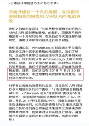 近期多名亚马逊日本站卖家反映称,收到有关“与消费税金额相关的报告和MWS API规范更改”的邮件通知。