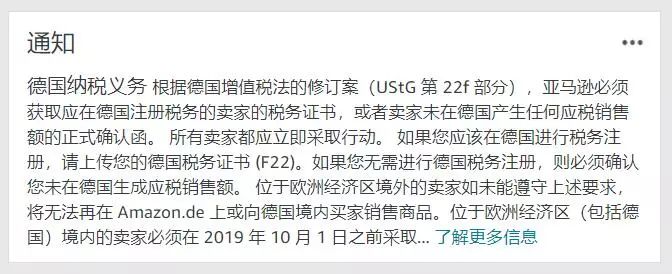 最近在亚马逊德国站首页收到一条通知,“德国纳税义务—根据德国增值税法的修订案(UStG第 22f 部分),亚马逊必须获取应在德国注册税务的卖家的税务证书,或者卖家未在德国产生任何应税销售额的正式确认函。所有卖家都应立即采取行动。 如果您应该在德国进行税务注册,请上传您的德国税务证书 (F22)。如果您无需进行德国税务注册,则必须确认您未在德国生成应税销售额。位于欧洲经济区境外的卖家如未能遵守上述要求,将无法再在 Amazon.de 上或向德国境内买家销售商品。位于欧洲经济区(包括德国)境内的卖家必须在 2019 年 10 月 1 日之前采取行动。”