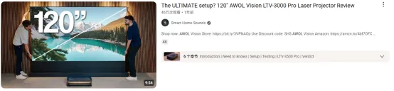 YouTube 平台中,视听与科技爱好者博主 @Smart Home Sounds 发布的评测视频,聚焦 AWOL Vision LTV-3000 Pro 超短焦激光投影仪搭配 120 英寸抗光地升幕布的家庭影院方案 —— 视频开篇直接对比 65 英寸电视与 120 英寸投影的尺寸差异并提问 “你会选择哪一个”,随后详细介绍产品核心优势、画质表现、游戏体验,以专业且客观的评测建立信任,打动注重设备性能的视听发烧友群体。