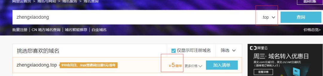 1:去买一个5块钱的域名:.top org,xyz的,去阿里云买!如下图: