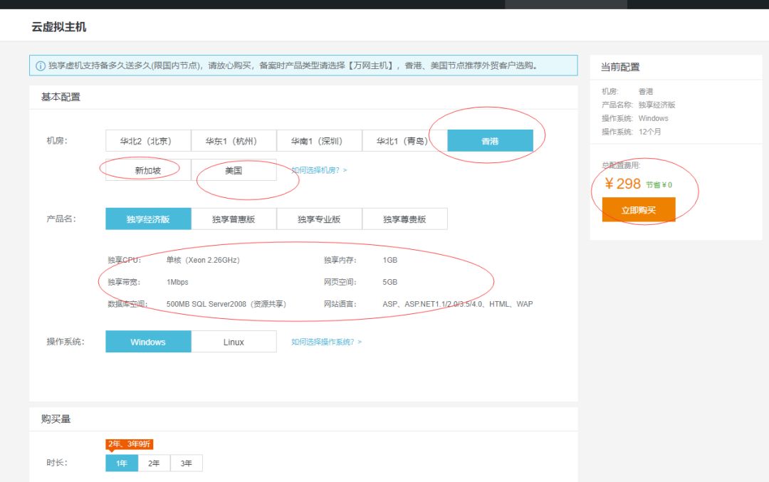 2:去买一个298元的云虚拟主机!如下面截图,有香港/美国/新加坡的!