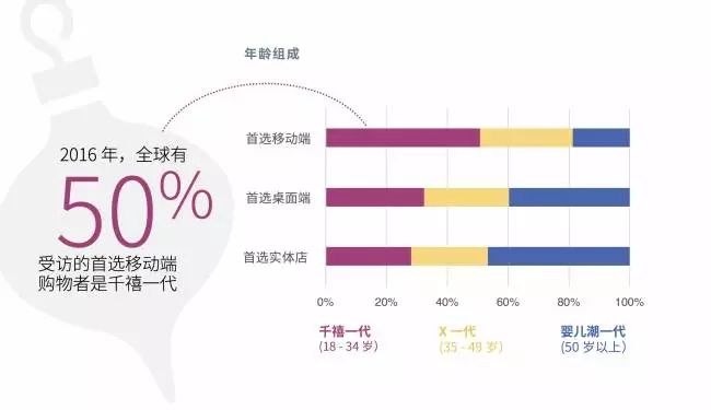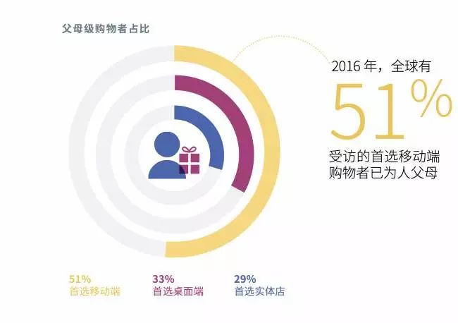 年轻消费者和父母正在主导移动端的购物趋势。调查显示,2016年全球有50%首选移动端购物的受访者是千禧一代。而为人父母的消费者由于对手机极为依赖,首选通过移动端购物的比例同样高达51%❸ 。