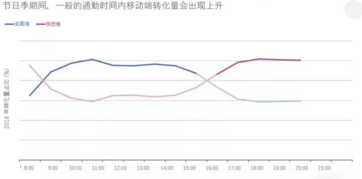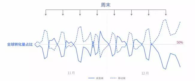 纵观节日季的在线交易数据,每逢周末移动端的转化率便会有所提升,总份额从工作日的50%提升至56%。