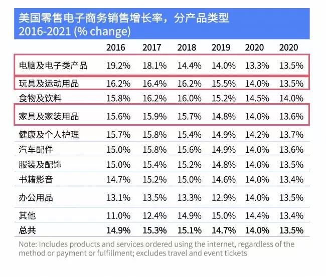 美国零售电子商务不同产品类型的销售增长率,2016-2011