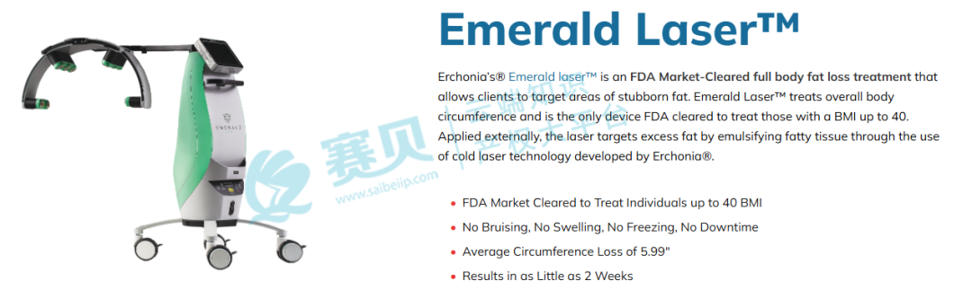 其明星产品 “Emerald Laser”(祖母绿激光减脂仪)是本次维权的核心,该产品:获 FDA 市场准入认证,可用于 BMI≤40 人群的全身及局部减脂;采用 532nm 绿色激光技术,是原告 2 项核心专利的商业化体现;凭借 “安全、高效” 的特点,积累了大量临床数据及消费者口碑,相关设备单价高达数万美元,是医疗美容设备中的高价值品类。