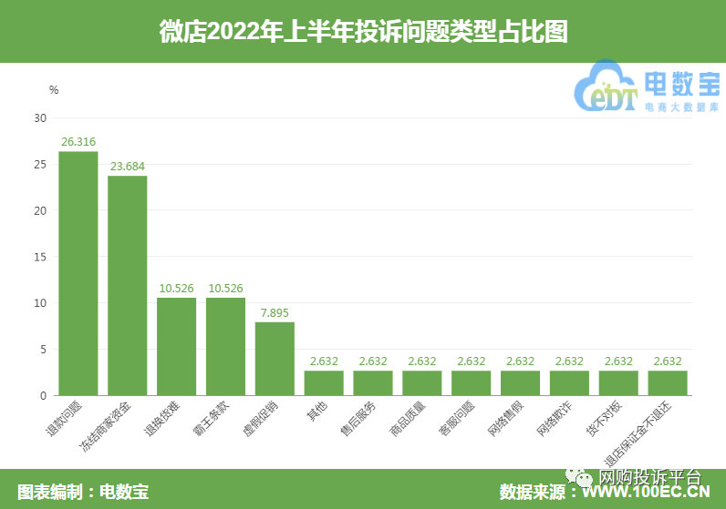 此外,“电诉宝”受理用户维权案例显示,“微店”在2022年上半年还疑似存在退款问题、冻结商家资金、退换货难、霸王条款、虚假促销、售后服务、商品质量、客服问题、网络售假、网络欺诈、货不对板、退店保证金不退还等问题。