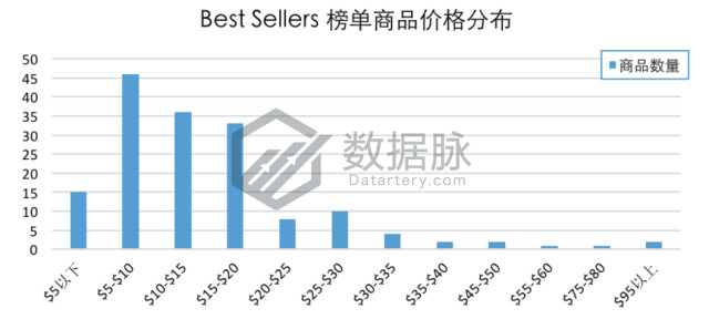 本期分析中Toys & Games品类Best Sellers榜单商品最高价$99.99,最低价$1.0,平均价格$15.9。骆探长(shujumai.com)发现,上榜的商品的平均价格稍有上涨,但仍有大量商品分布在低价位区间;在$5.00-$10.00区间内的商品数量最多,占比达28.57%;此外,有22.36%的商品价格分布在$10.00-$15.00;另外,仅有2款商品价格超过超过$95。