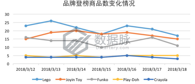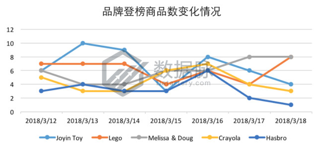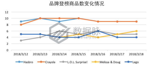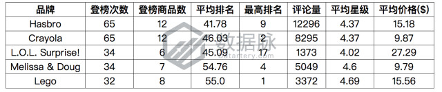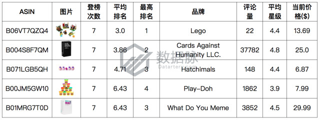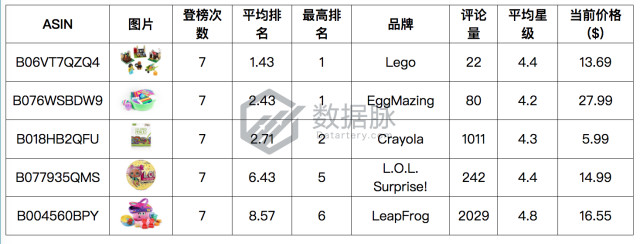 品牌Play-Doh的橡皮泥玩具套装稳定在榜单前十,以平均排名6.43位居榜单第四;