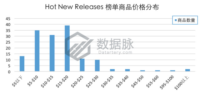 在Toys & Games品类Hot New Releases榜单分析中,商品最高价$173.23,最低价$0.01,平均价格$16.42。骆探长(shujumai.com)发现,上榜商品的平均价格稍有下降,较多商品的价格位于$15.00-$20.00区间以内,占比25.49%,该区间商品数量有所增多;有22.88%的商品价格位于$5.00-$10.00;在Hot New Releases榜单中,仅有2款商品价格高于$100,占比达1.31%。
