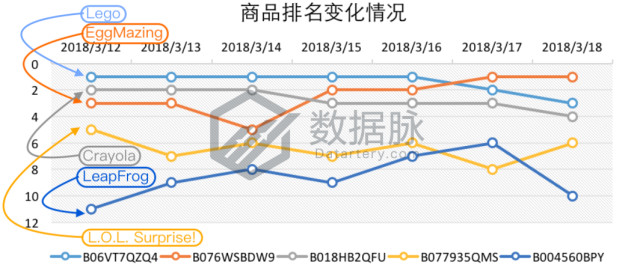 可以看到,在本期Toys & Games品类的Best Seller榜单中排名前五中,骆探长(shujumai.com)发现,品牌Lego的复活节主题积木套装,连续五度登顶榜首,可惜最后两日排名下滑,但仍以平均排名3.0荣膺综合排名首位;