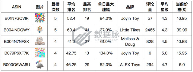 品牌Little Tikes的水上游戏桌登榜5次,以平均排名43.0位居综合排名第二位,其单日最大涨幅高达37.0%;