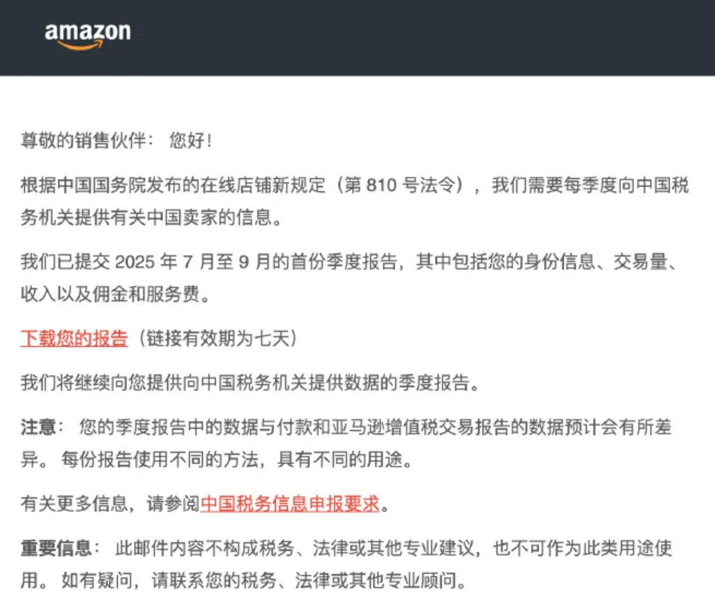 亚马逊季度税务报告正式推送:卖家数据为何“对不上账”?这两天,不少亚马逊卖家几乎在同一时间,收到了来自平台的一封“重量级”邮件。图源:卖家爆料邮件内容并不复杂:根据中国最新监管要求,亚马逊需要按季度向中国税务机关报送中国卖家的相关经营数据,并且会将同一份季度税务报告同步给卖家本人查看。首份报告已覆盖 2025年7月至9月,下载链接仅保留7天。表面来看,这是一件“信息更透明”的好事。但真正打开报告后,卖家圈却迅速炸锅——图源:知无不言大量卖家发现:报告里的收入、利润、成本,和自己平时核算的账,差得不止一点点。一、亚马逊季度税务报告,到底报了哪些内容?先明确一个事实:这份报告并不是“卖家利润表”,而是平台按监管要求生成的一份信息披露报告。