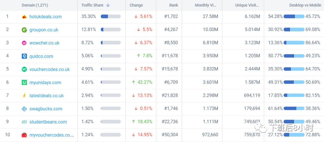 在做海外deal之前,先要知道你所做国家有哪些比较有名的deal网站?这种方式就很多了,可以直接在Similarweb(similarweb.com)去找一些deal site的list, 选择E-commerce_and_Shopping~Coupons_and_Rebates 这个类别,以UK为例