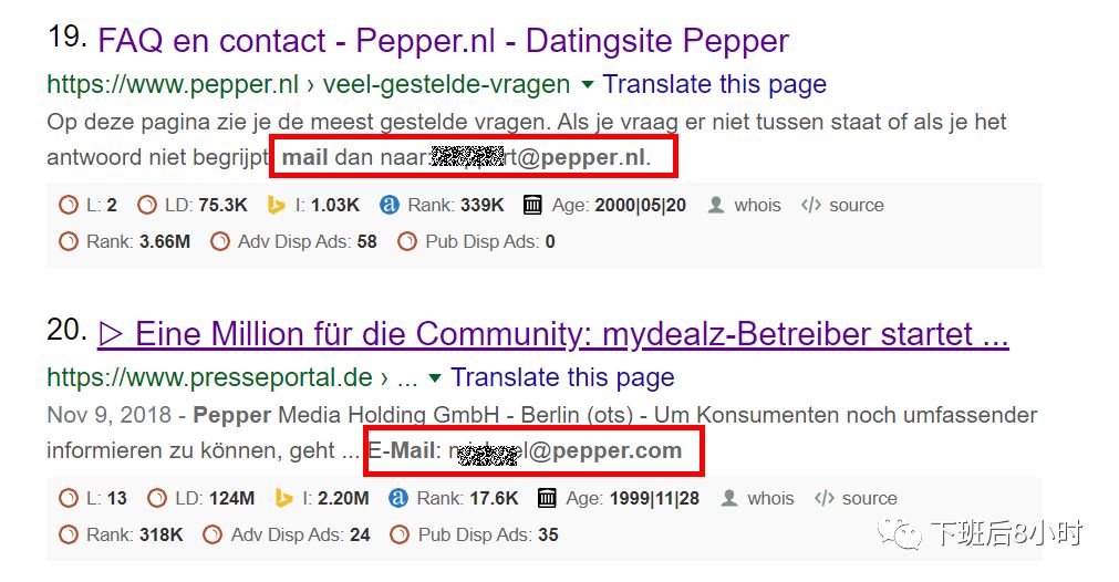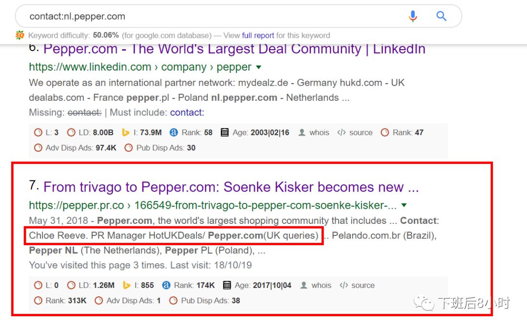 首先就是用谷歌Search搜索,可以在输入框输入"mail to:nl.pepper.com","email:nl.pepper.com","contact:nl.pepper.com"或者“Inurl:contact from nl.pepper.com”等, 其实学会使用谷歌搜索指令,对你的平时的工作帮助真的非常大,对于你开发红人, B2B客户还是搜索其他合作伙伴,