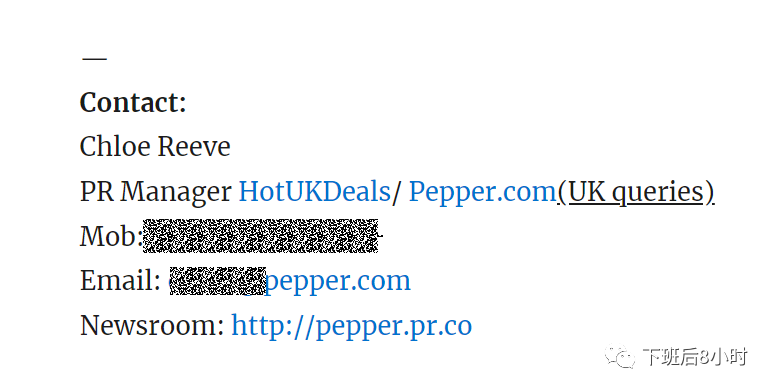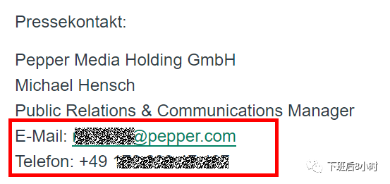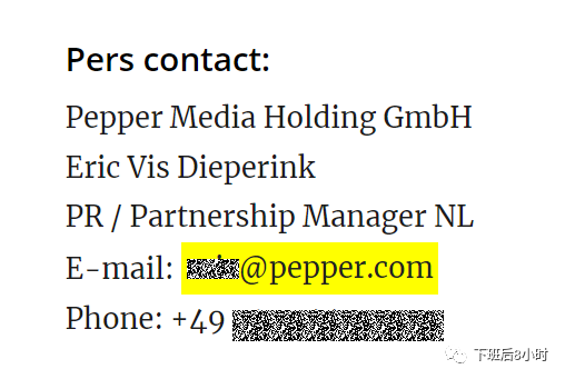 可以看到谷歌搜索的第七条有非常关键的联系信息我们就点击进去,这篇文章主要介绍的就是Pepper这个公司的简介,在文章的最下面可以看到留下了PR Manager的邮箱跟电话,然后我们就可以尝试加下这个手机号是不是whatsapp number,也可以发邮件说明来意。
