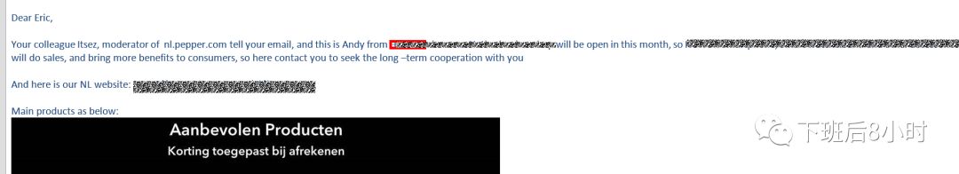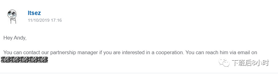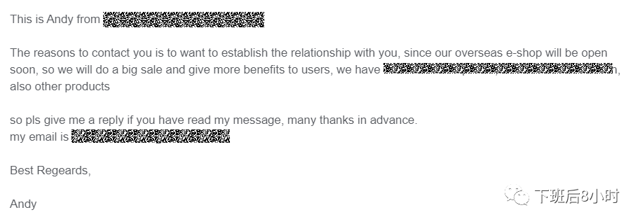 其实还有很多种方法关于如何找deal的联系方式,大家可以翻看下之前的文章,介绍的非常非常详细, 下一篇会写下目前如何开发红人的一个过程,欢迎大家继续关注微信公众号(下班后8小时)。