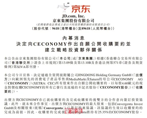 2025年7月,京东宣布将通过全资间接子公司JINGDONG Holding Germany GmbH,向德国消费电子产品零售商CECONOMY的所有股东发起自愿公开收购要约。同年12月,京东宣布在额外要约接受期结束后,将拿下其59.8%的控制性股权,在当时创下了中国电商出海欧洲的单笔收购规模新纪录。