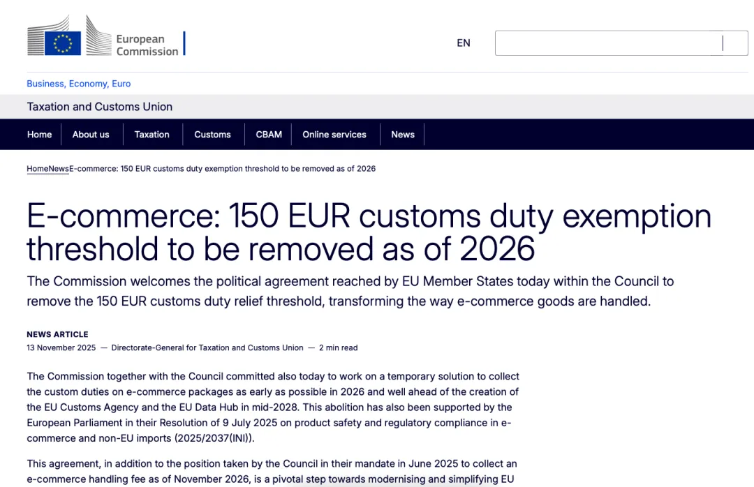 自2026年7月起,欧盟将废除沿用数十年的150欧元以下小额包裹关税豁免政策,改为对每一件进口商品统一征收3欧元关税。Joybuy的上线,正好踩中这一倒计时。
