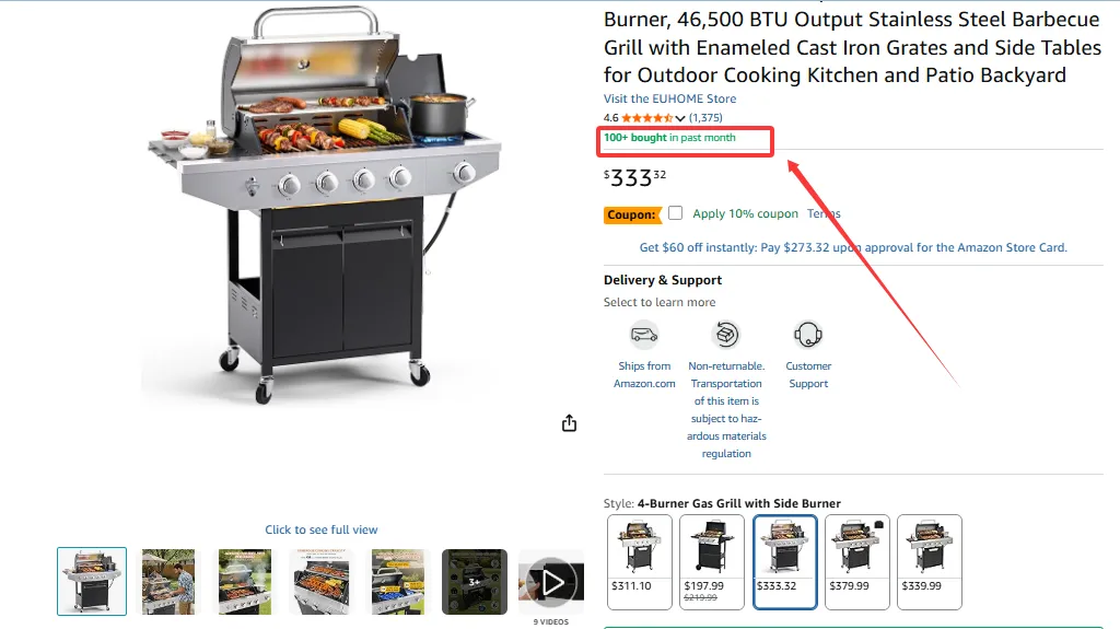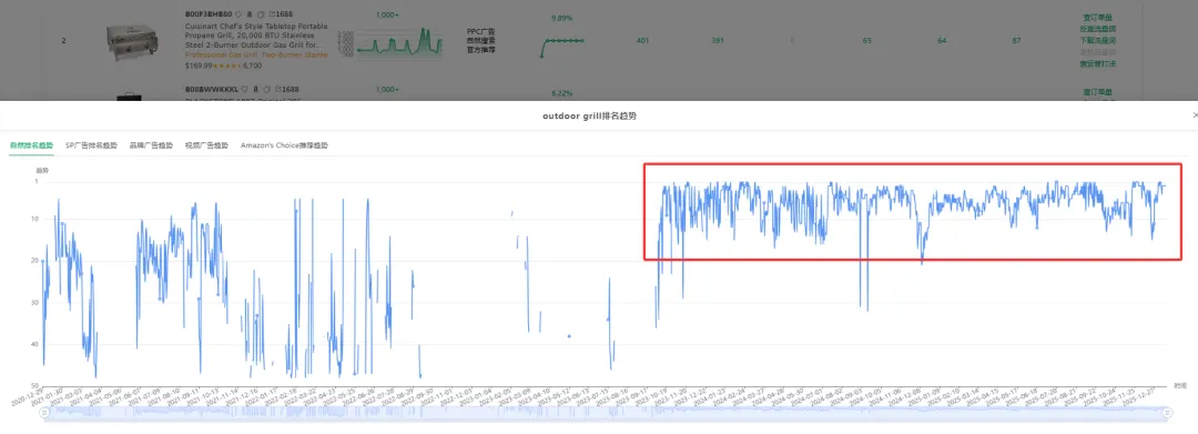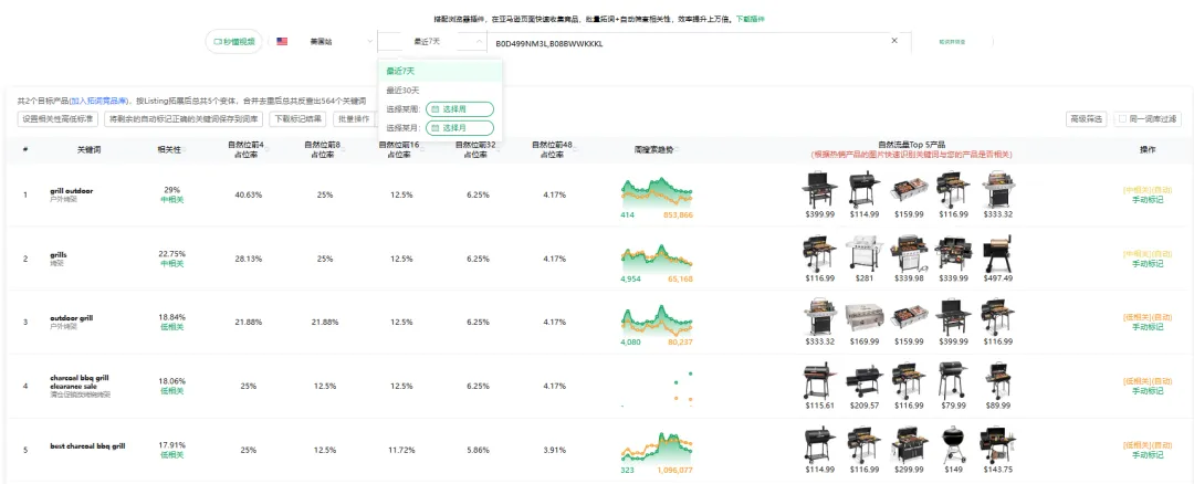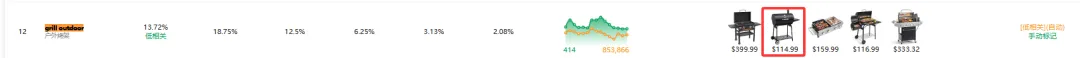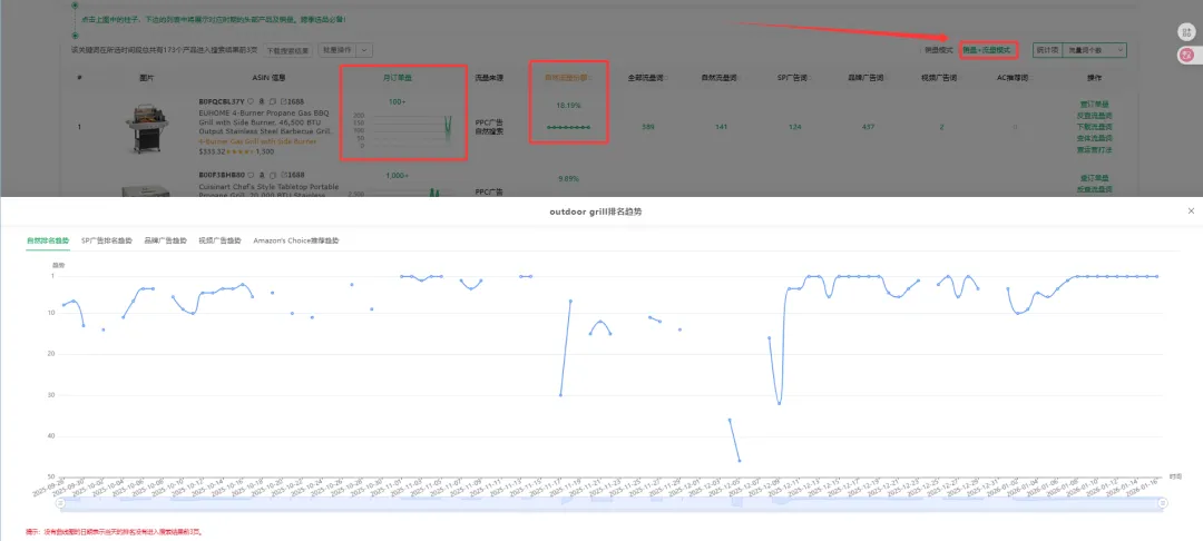 我自己觉得这个占位率可能是说竞品在这个关键词下面自然搜索结果占据的位置比例,有点拗口,我们举一个例子grill outdoor,自然位前4占位率40.63%,可能是说我那两个ASIN,他们两在自然位前4的概率有40.63%,多个产品具体的算法我确实不清楚,所以我单独搜索一款产品,显示这个前4的概率18.75%