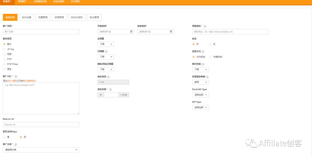 可以看到素材类型有几个选项,这是你投放流量的格式。一般是这几个类型,Images,JS Tag,视频,POP,POP Prime,原生。这里你觉得玩的最多是哪个素材类型?