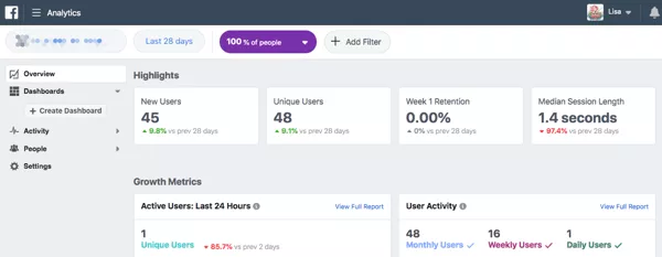 要开始使用Facebook Analytics,您需要做的就是选择您的Facebook像素,它将开始为您提供数据。然后,您需要创建一个事件源组或ESG,它连接您的Facebook业务页面和Facebook像素,以便您可以从更多数据源(如Messenger bot)中进行绘制。仪表板显示所有来源的实时汇总数据,您可以看到它们如何协同工作。