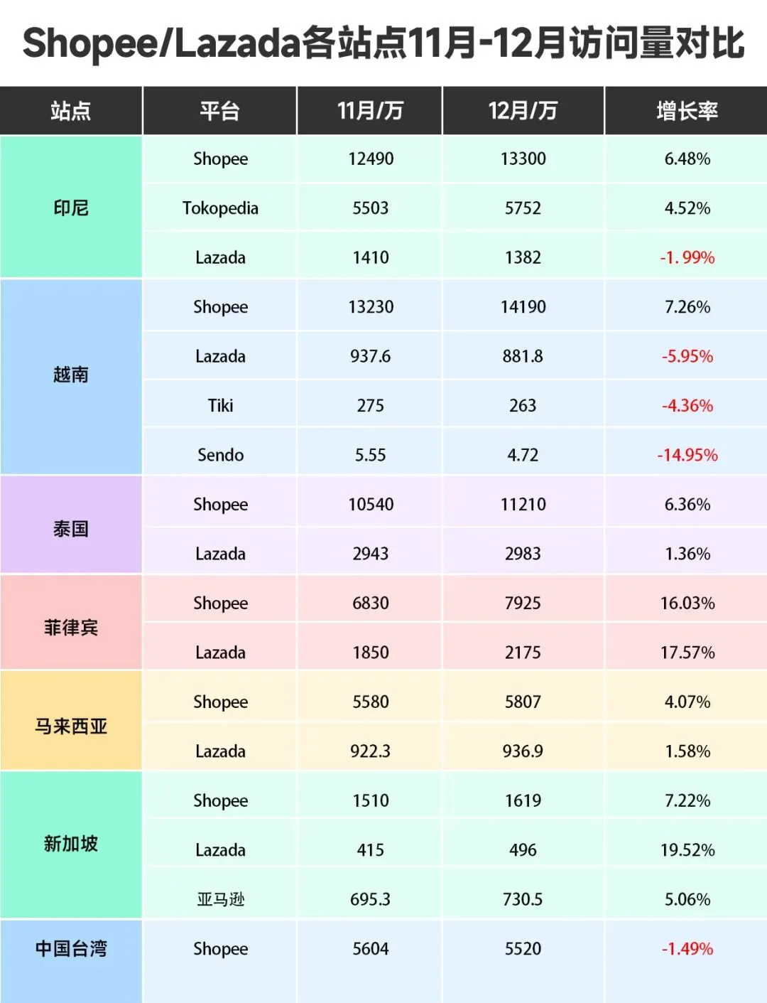 点击上方🔝图片,立即体验紫鸟浏览器2025年12月东南亚电商平台访问量数据出炉:Shopee全线增长,菲律宾站以16.03%增幅领跑;Lazada印尼、越南站小幅下滑,但新加坡站反弹19.52%,菲律宾站增长17.57%。
