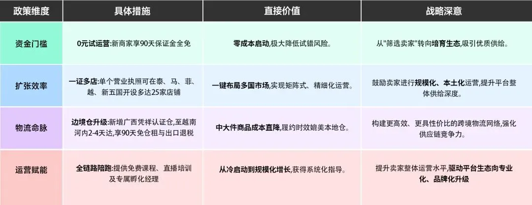 这四大政策环环相扣:以零保证金吸引入场,以一证多店助其快速扩张,以边境仓保障物流体验,再以全链路陪跑提升成功概率。