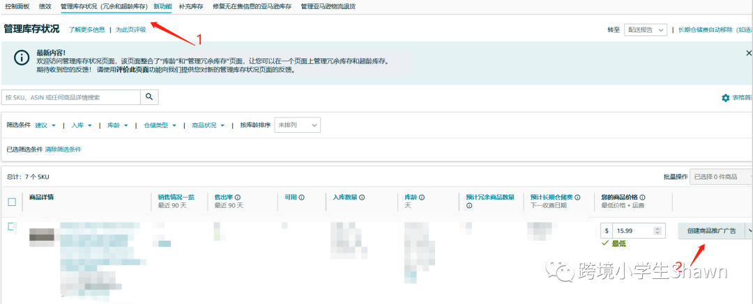 点击亚马逊后台的库存规划,进入管理库存状况,然后点击下图所示的第2点。