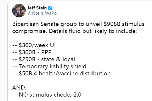 12月1日,一个由两党参议员组成的小组公布了规模9080亿美元的经济刺激方案,以便打破持续数月之久的僵局。根据这份跨党派救济方案,企业将获得约3000亿美元的类似“薪水保护计划”的资金注入,州和地方政府将获得2400亿美元,其中包括用于学校的资金。另外1800亿美元将用于延长每周额外300美元的失业金补助,为期四个月。
