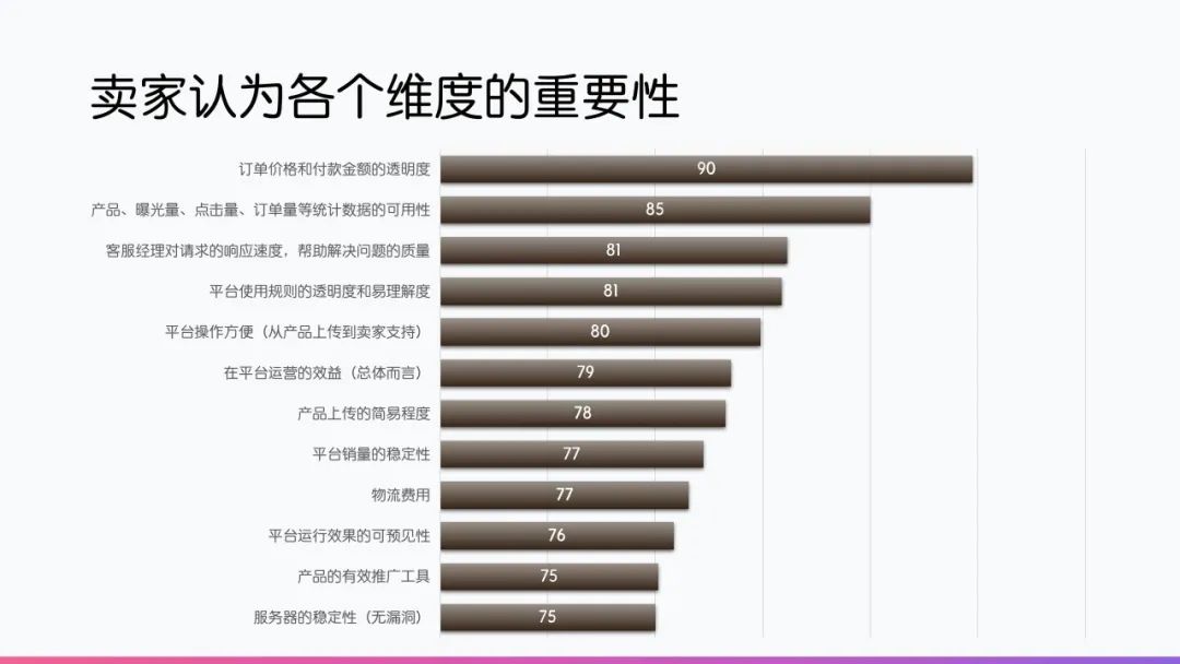 我们整理了一些与平台运营相关的维度,邀请卖家对这些维度的重要性进行打分。可以看到,卖家对于平台的订单价格以及付款金额的透明度、平台的分析数据等内容非常重视。