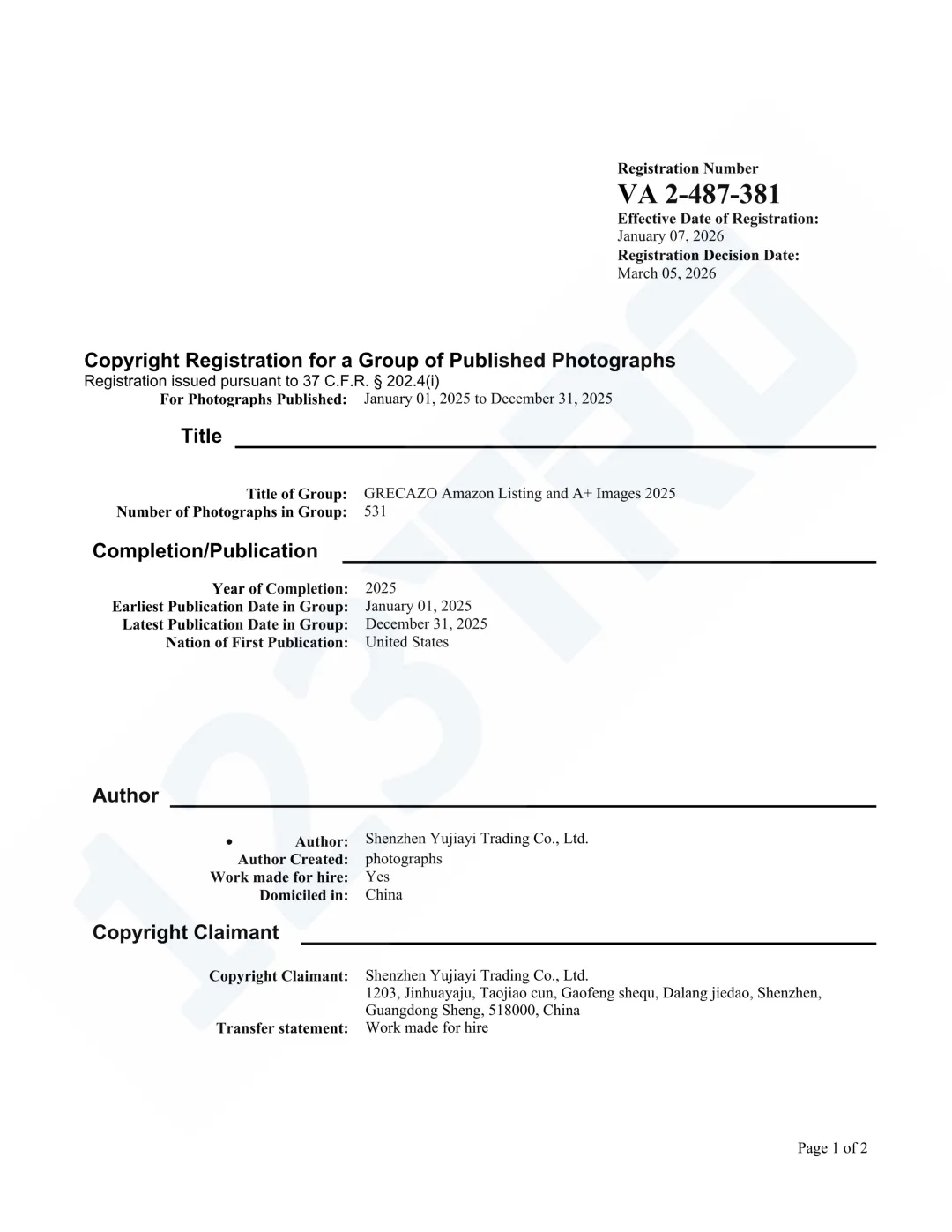 持有人为品牌“GRECAZO”的产品、listing、A+等元素申请了版权,换个角度说,这种方式既保护了产品图,又能保护描述文字,简直一举两得