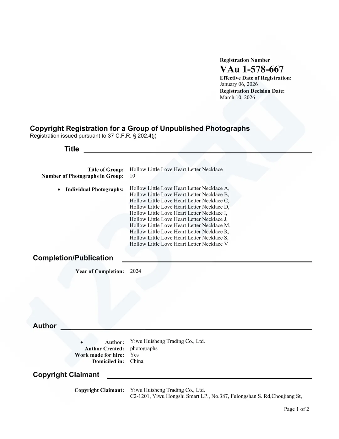 持有人:Yiwu Huisheng Trading Co., Ltd.
