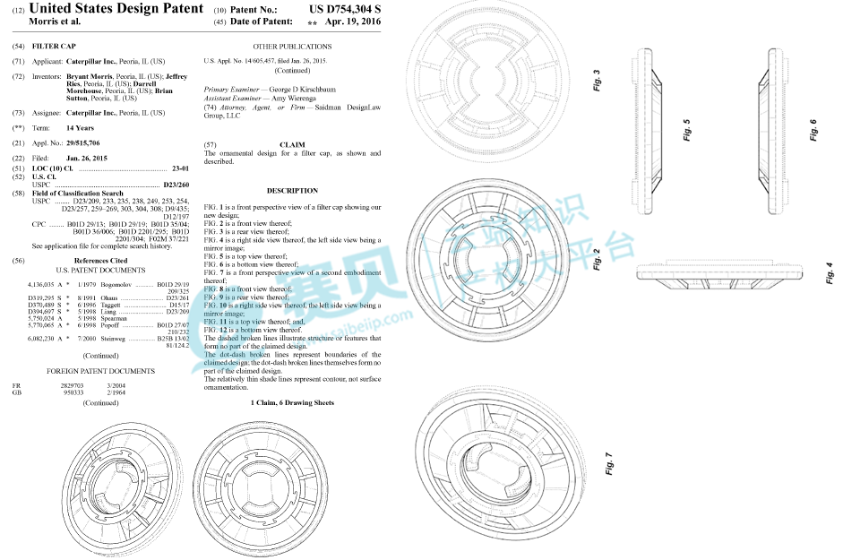 案件涉及过滤器的D754,304外观专利,2015年1月26日申请,2016年4月19日授权,Caterpillar的过滤器主要适配自家 CAT® 发动机,而市场上常见的 “适配型(will-fit)” 过滤器,若外观与 D754,304 专利设计 “实质性相似”,即使未使用 CAT® 商标,也可能构成外观专利侵权