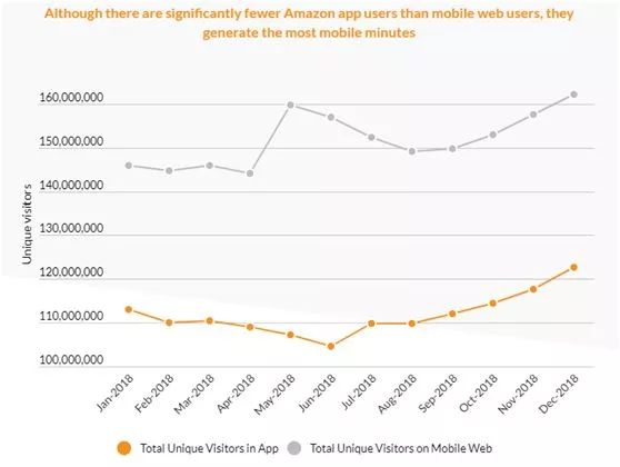 (尽管亚马逊APP用户少于亚马逊移动网页用户,但前者在亚马逊花费的时间远高于后者)