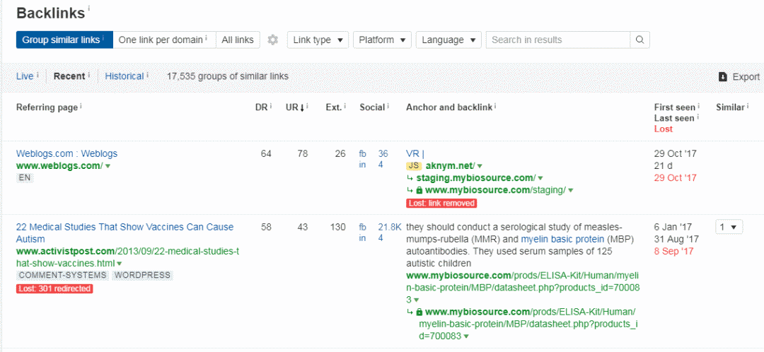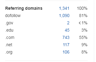 Referring domains(相关域名):网站外链来源域总数。(backlinks是外链总数,这个是来源域数量,比如说有1000条外链,但是这些外链全都来自三个网站,那它的Referring domains就是3!)