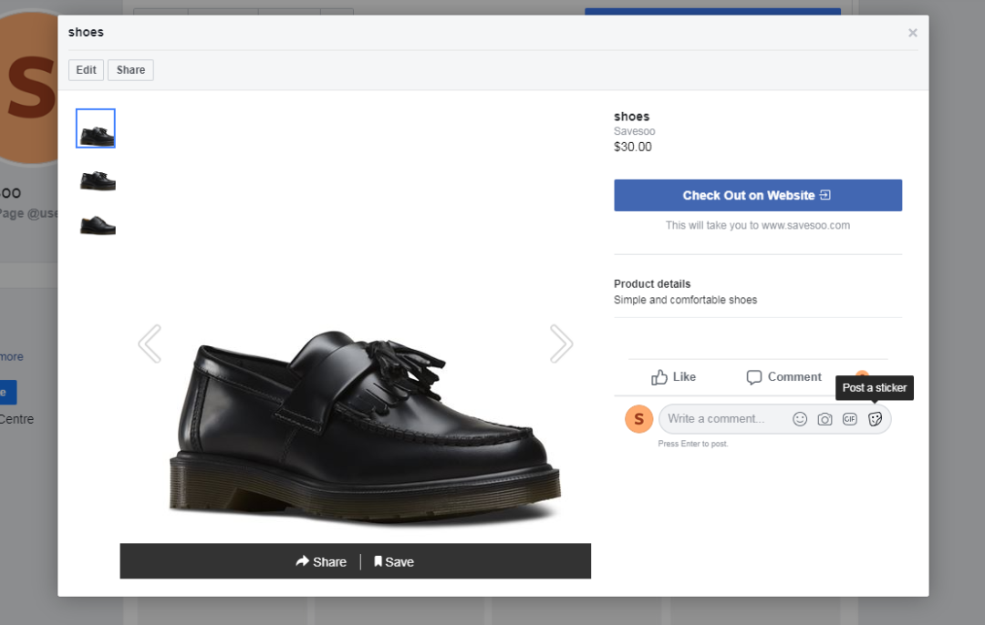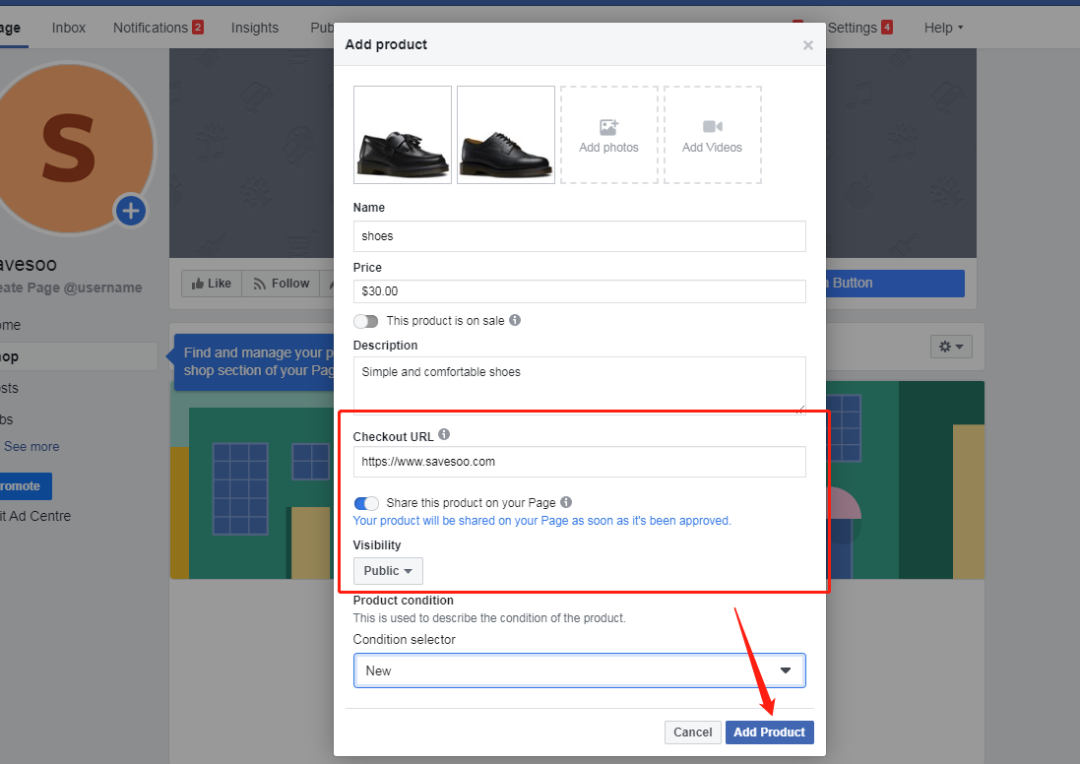 你需要上传产品的图片或者视频,填写产品名称、价格、说明来吸引买家。由于本文是以把买家转到网站以完成购买为例来说明,因此需要为特定产品添加网站网址。填写完成后,请务必点击允许共享。