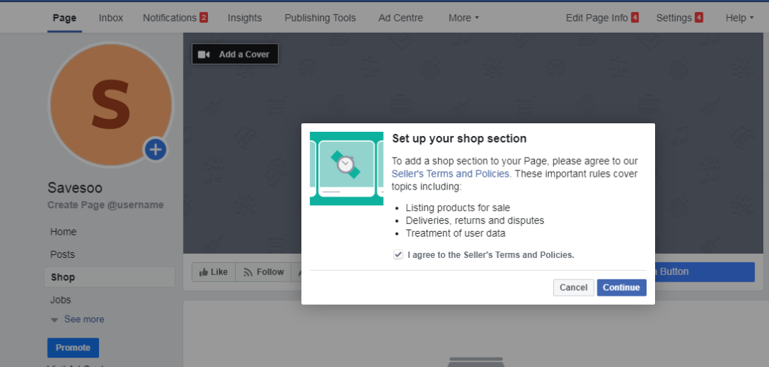 添加完成后,回到page页面,点击shop,要继续操作,你必须同意Facebook的卖家条款和政策。在同意并单击“Continue”之前,请务必阅读相关内容。
