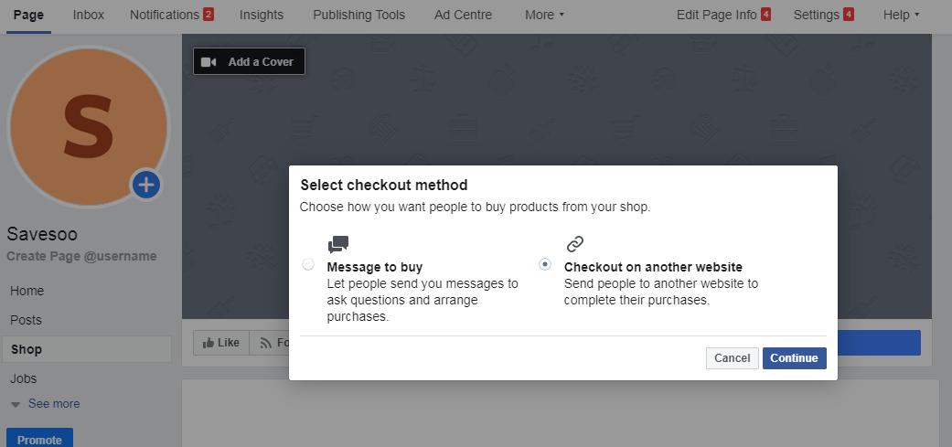 接下来,Facebook将询问你想如何让用户从你店铺购买产品。美国以外的任何地区有两种选择:“Message to buy”和“Checkout on another website”;本文是以Checkout on another website为例;