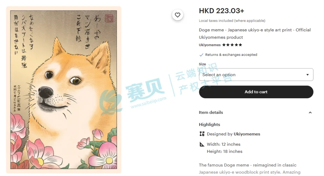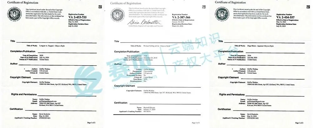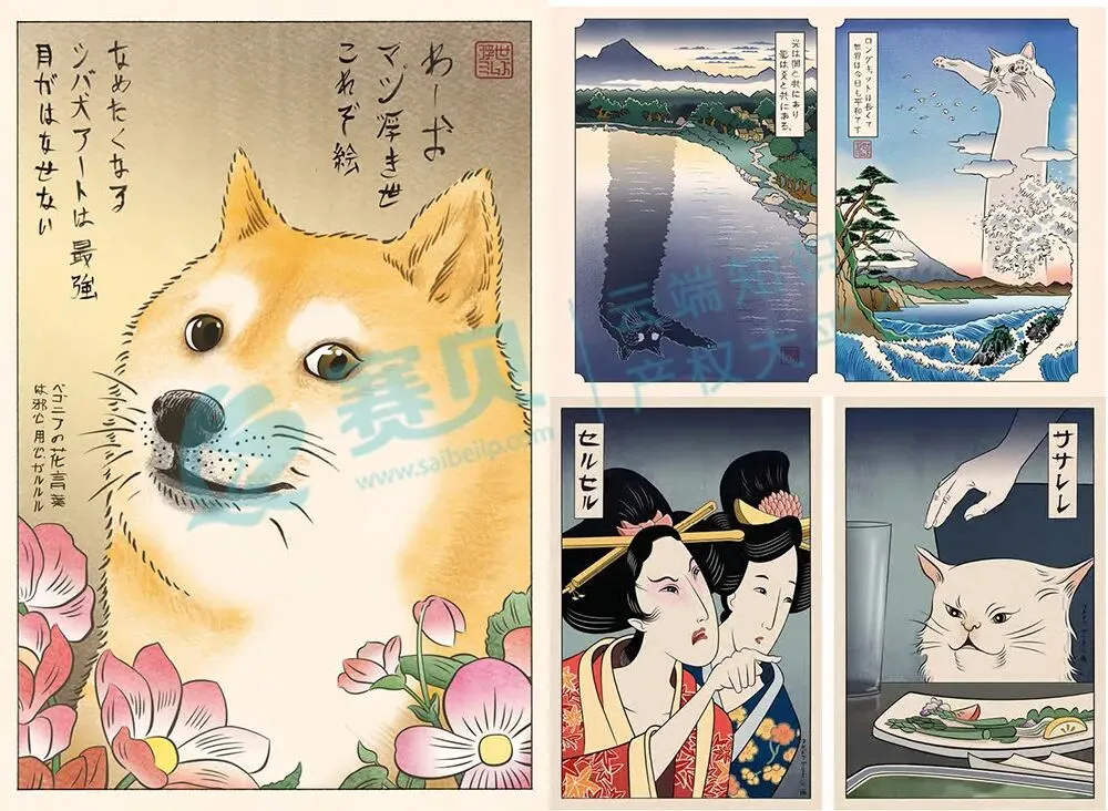 此次维权的是 Griffin Waldau的3件注册版权作品:《Woman Yelling at Cat - Ukiyo-e Style》《Longcat vs. Tacgnol - Ukiyo-e Style》《Doge Meme - Japanese Ukiyo-e Style》,其核心是 “网络meme文化+日本浮世绘艺术” 的融合创作。赛贝提醒,未经 Griffin Waldau 或其授权方书面许可,任何人不得擅自复制、发行、销售相关衍生产品,也不得创作相似侵权作品。