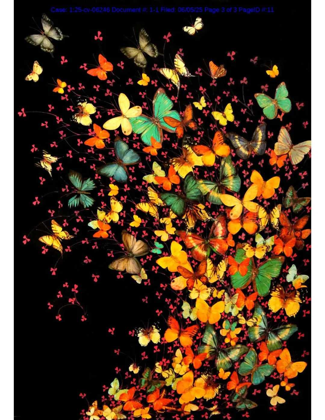 原告Elizabeth Anne Evans(艺名Lily Greenwood)是一位英国女画家,以融合东方韵味的自然主题绘画作品闻名。她的作品常以自然元素为主题,如鸟类、锦鲤和蝴蝶等,受到十八世纪日本版画家北斋和广重的影响,同时结合了日本和服设计的元素。本次案件涉及的版权作品为《Butterflies on Black》。此外,原告名下还有28项蝴蝶相关版权。