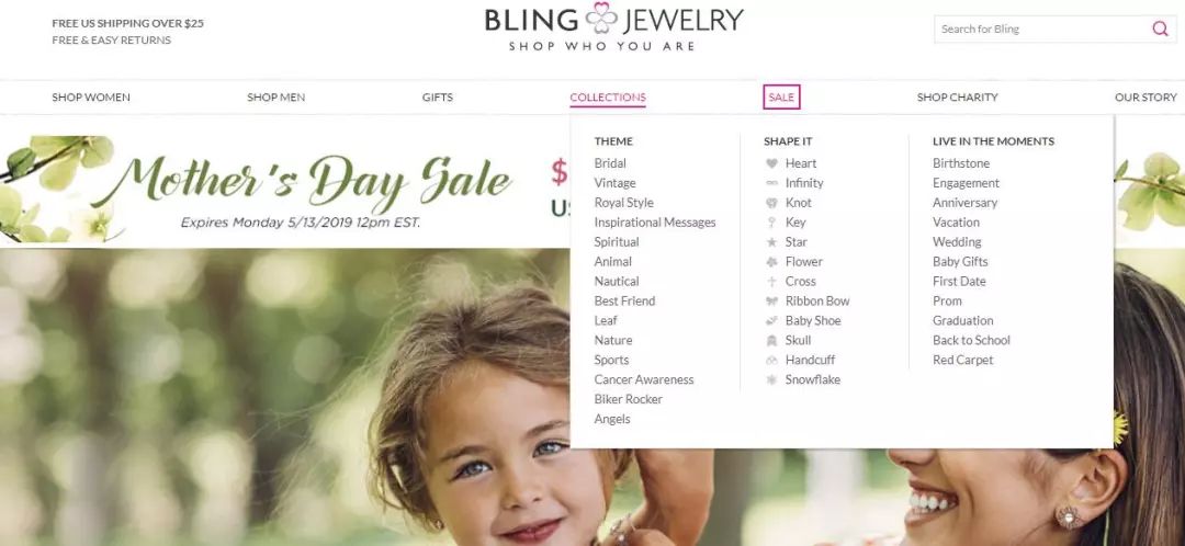 Bling Jewelry也是一个利基产品的优秀例子,提供一流的在线用户体验。访问者不仅可以按产品类目购物,也有其他选择,比如按主题、形状和场合购物。总的来说,这个网站的导航有点特殊。
